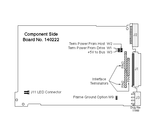 W1 and W2 select the source of power (+5V) for the interface terminators; W3 controls the drive supplying +5V to the bus.